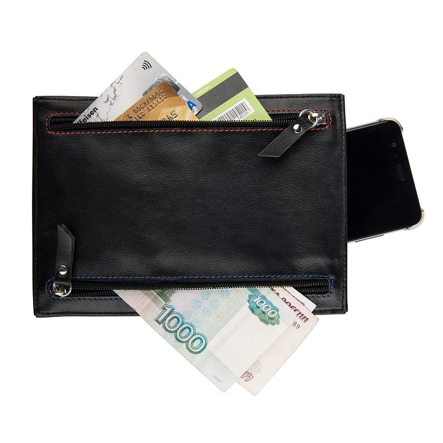 Органайзер для путешествий или деловых поездок с 5 карманами. 4 кармана на фронтальной поверхности, каждый выделен цветом, чтобы было удобнее запомнить расположение документов денег по цвету. В двух карманах дополнительно есть холдеры для кредитных карт визиток. Большой внутренний карман на кнопке. Можно использовать для смартфона или для паспорта.