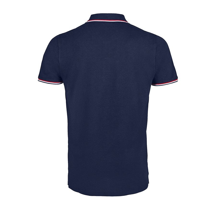 Мужская футболка поло с боковыми швами. Воротник и манжеты вывязаны резинкой 1*1 Контрастные полоски на воротнике, по низу рукавов, внутри бокового разреза и на внутренней стороне воротника. Планка поло на двух пуговицах. Лейбл с размером находится во шве горловины, лейбл производителя вшит в в боковом шве изнутри.