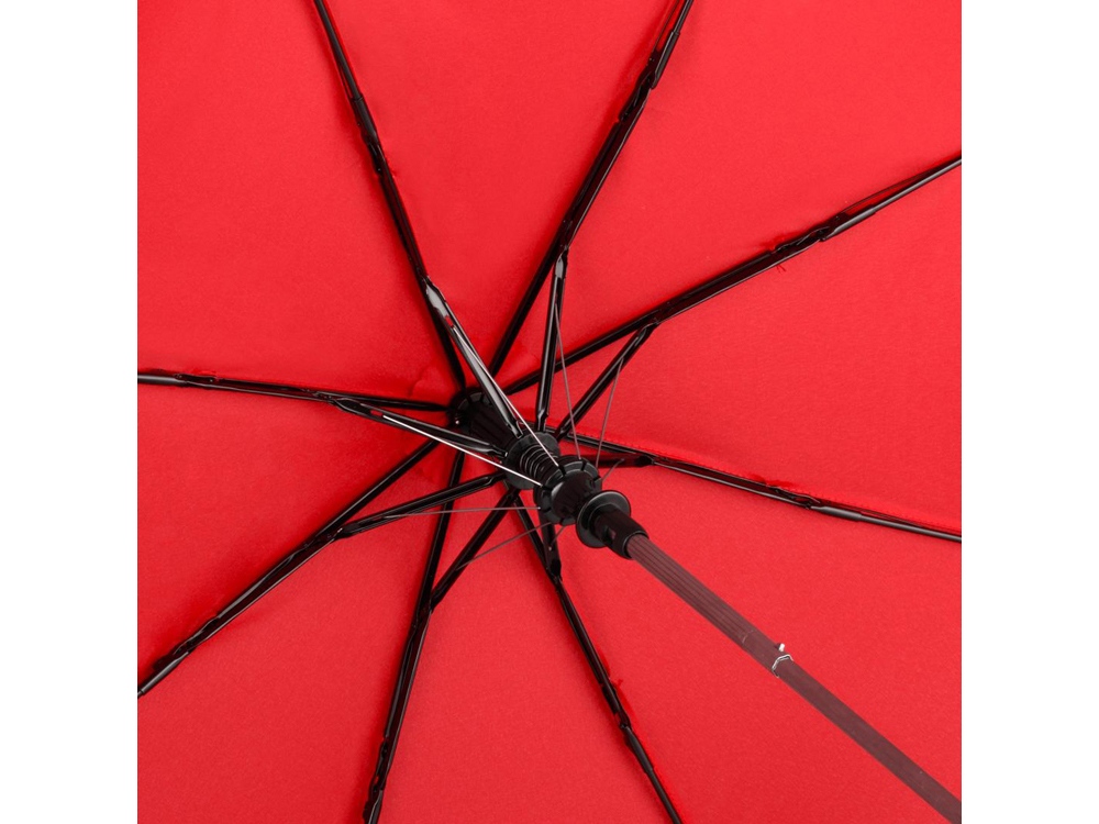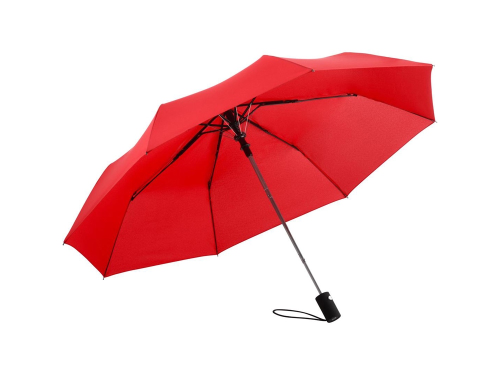 Полуавтоматический складной зонт открывается нажатием кнопки на ручке. Для большего удобства на ручку нанесено покрытие soft touch и добавлен эластичный шнурок.