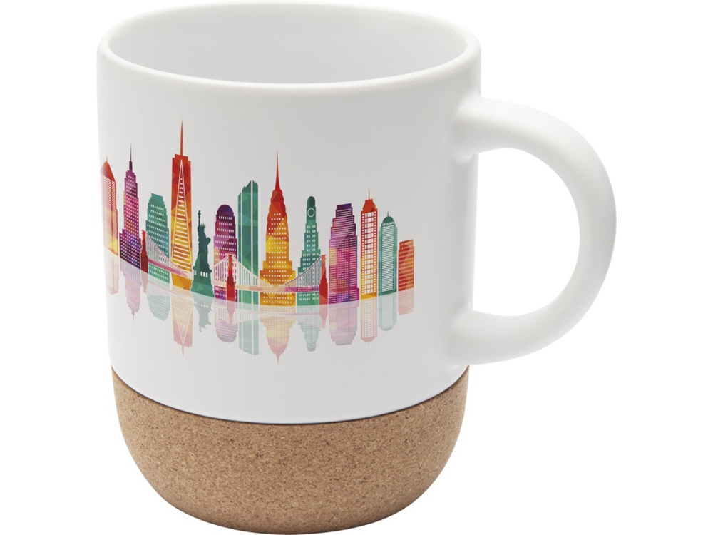 Керамическая кружка с пробковым основанием и внешним покрытием, подходящим для сублимационной печати. Внутренняя и внешняя поверхности выполнены в глянцево-белом цвете. Рекомендуется мыть вручную в тёплой воде с мягкими моющими средствами. Поставляется в подарочной коробке из переработанного картона. Объём — 300 мл. Состав: 90% керамика, 10% пробка.