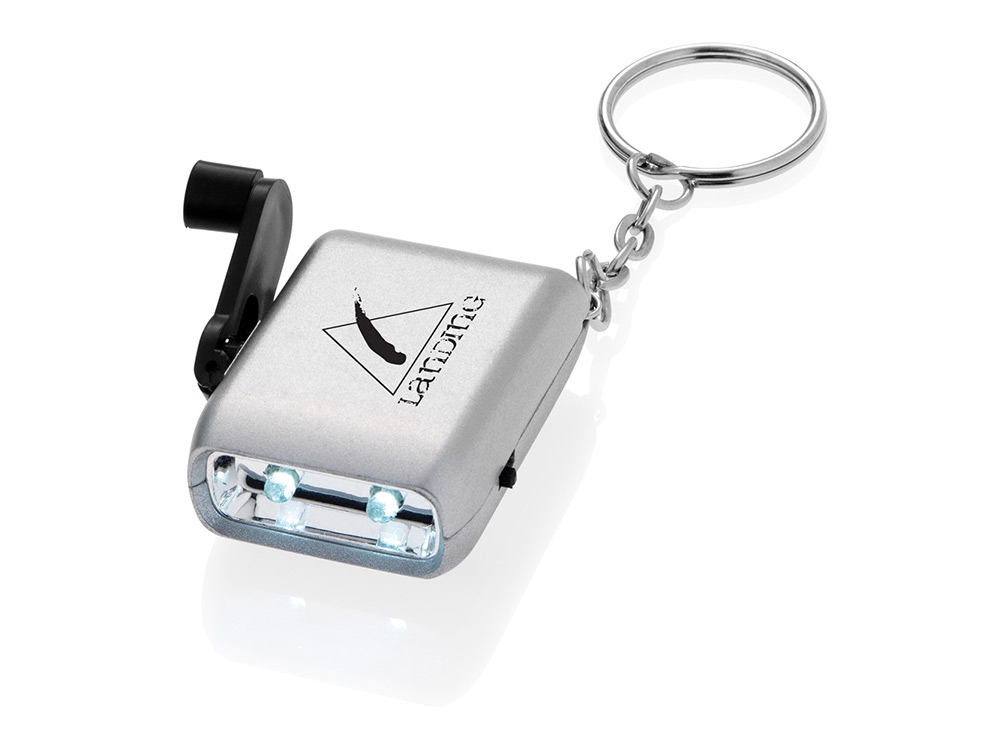 Портативный динамо-фонарик. 2 диодные лампочки. Кнопка включения/ выключения. Батарейка в комплекте. Тампопечать (1 цвет (цветные изделия)) на данный товар осуществляется бесплатно. Оплачивается только настройка оборудования в размере 2300 рублей на весь тираж.
