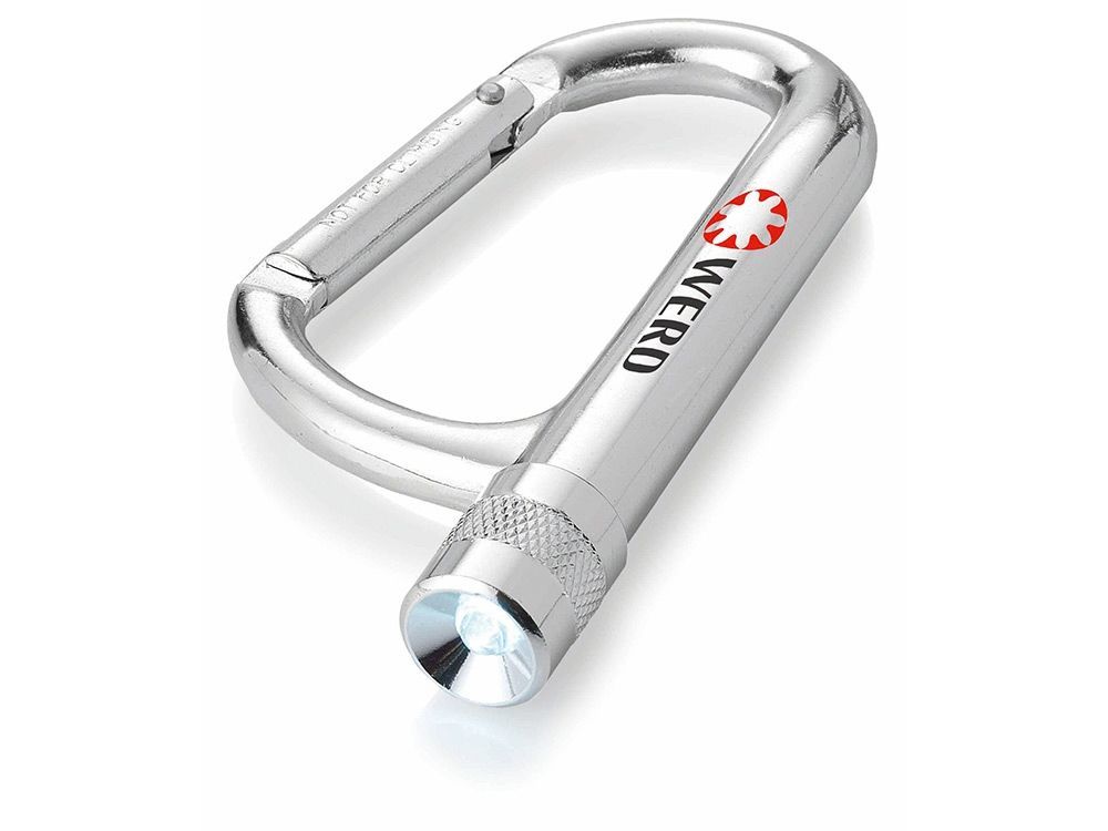 Карабин с фонариком Mira. Легко прикрепить к сумке или рюкзаку. Яркий диодный фонарик. Поворотный механизм включения. Карабин не пригоден для скалолазания. Батарейки в комплекте.