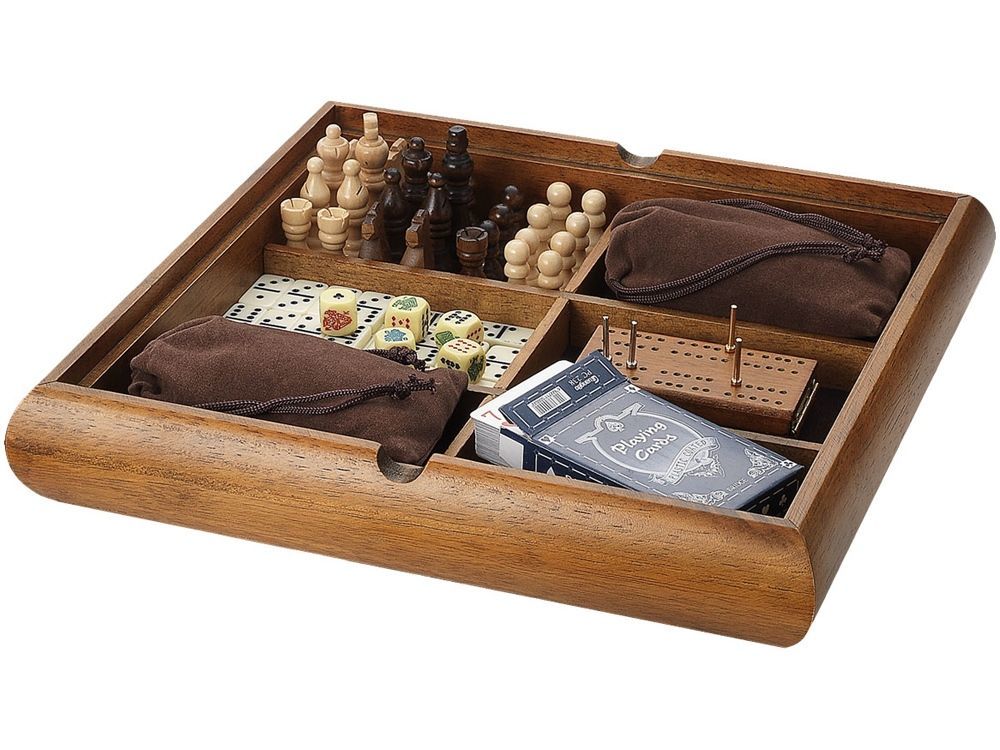Роскошный подарок для человека с хорошим вкусом. Стилизация под антиквариат. Набор из 6 популярных настольных игр: шахматы, нарды, криббедж, игральные карты, домино, игральные кости. Футляр-игровое поле выполнен из натурального дерева. Отличный имиджевый сувенир в винтажном стиле.