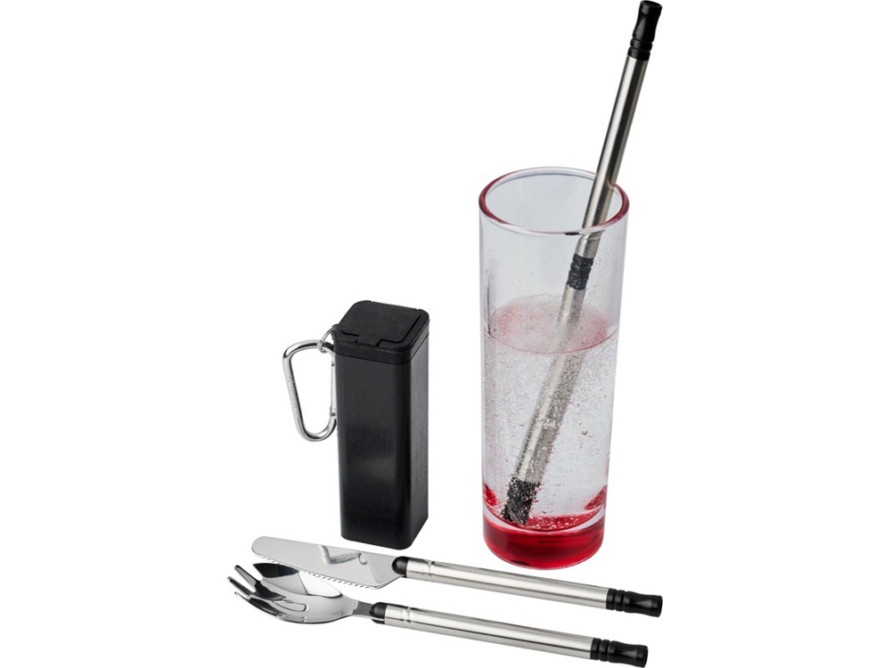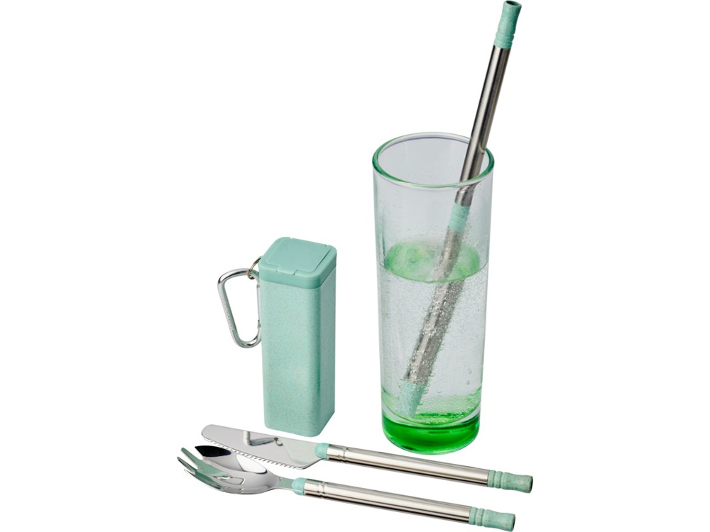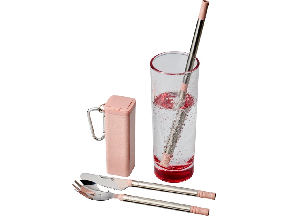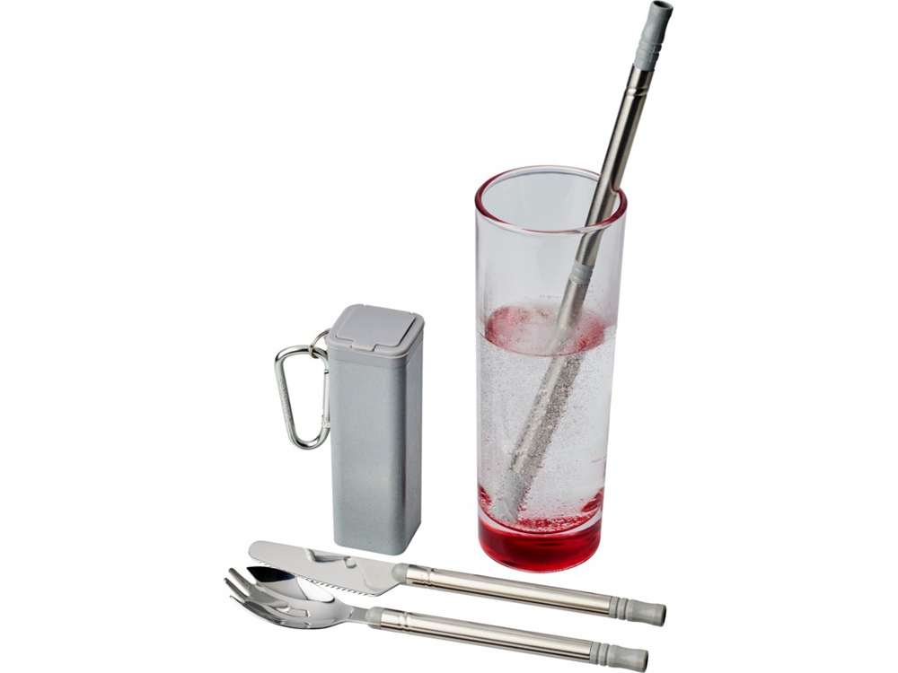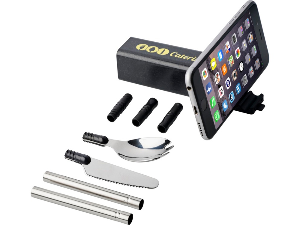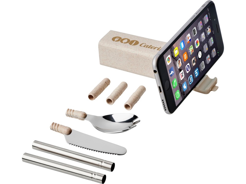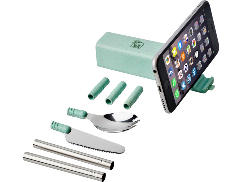 Набор столовых приборов Galen из пшеничной соломы с держателем для мобильного телефона. Переносной набор столовых приборов для удобного приема пищи на ходу. Столовые приборы поставляются отдельно для компактного хранения и легкой сборки. Состоит из ножа, ложки, вилки, соломенной трубочки и футляра для переноски. Солома — это стебли зерновых, использование которых позволяет сократить количество пластика в изделии. Пшеничная солома (51 %) / ПП-пластик (49 %), нержавеющая сталь, силикон.
