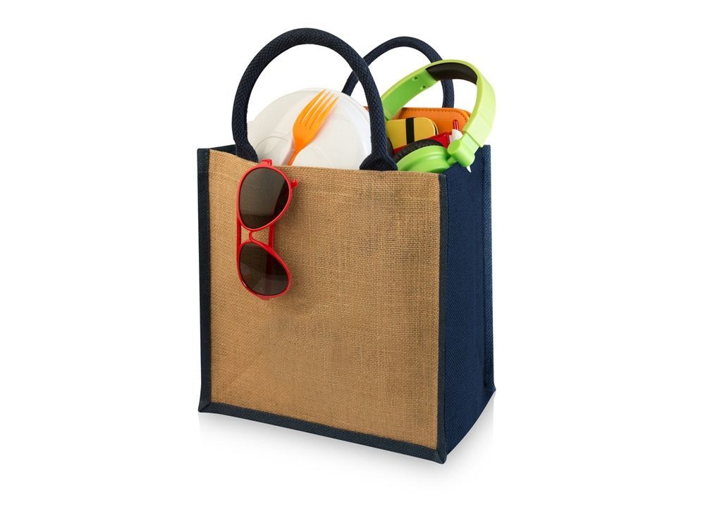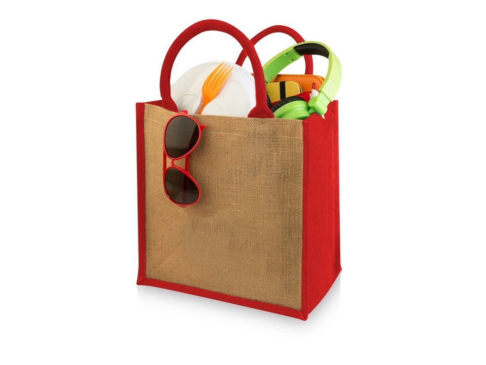 Джутовая подарочная сумка Chennai. Джутовая сумка с ламинированным открытым основным отделением и вставкой. Хлопковые ручки высотой 11,5 см. Джут.
