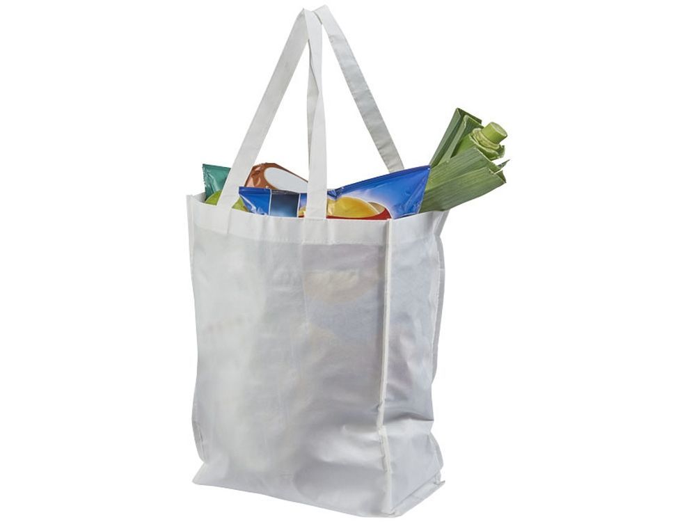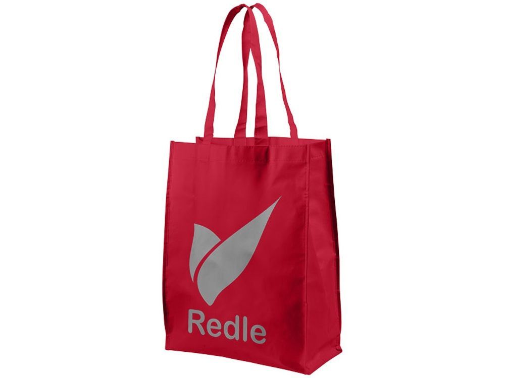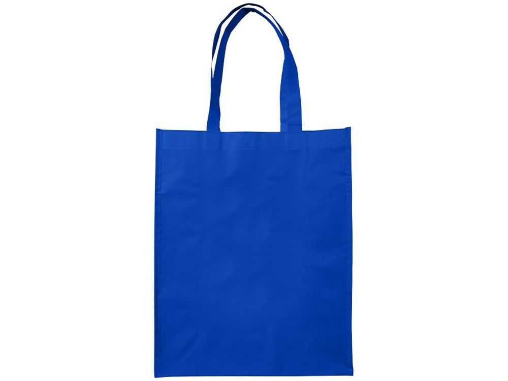 Ламинированная сумка для покупок среднего размера. Открытое основное отделение. Ламинированный материал водонепроницаемый и легко моется. Высота ручек 25 см. Ламинированный нетканый полипропилен 80г.