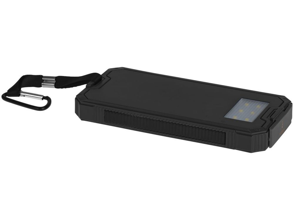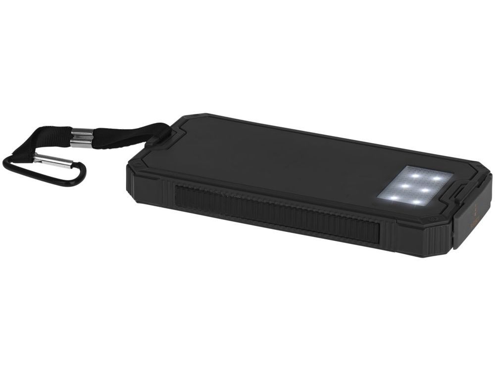 Зарядное устройство на солнечной энергии 10000 mAh. Это зарядное устройство, работающее на солнечной энергии, идеально подходит для любого отдыха на природе. Оно содержит литий-полимерный аккумулятор, и его емкость составляет 10000 мАч. В зарядном устройстве предусмотрен 1 выходной порт (5 В/2,1 A) и фонарик COB, идеально подходящий для использования ночью. Прорезиненная поверхность обеспечивает защиту от воды и царапин. Зарядное устройство может заряжаться от солнца или через кабель для зарядки с коннекторами USB и Micro USB, входящий в комплект. Зарядное устройство можно подвешивать за карабин, входящий в комплект. Предлагается в подарочной коробке Elevate. АБС-пластик.