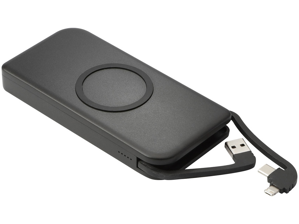 Беспроводное портативное зарядное устройство Umbra 10 000 мАч. Беспроводное портативное зарядное устройство Umbra содержит литий-полимерную батарею на 10 000 мАч класса А, беспроводной передатчик/приемник для зарядки и встроенный кабель 3-в-1 для всех устройств Apple® iOS и Android. Зарядку можно осуществлять как в беспроводном режиме, так и с помощью кабеля. Само зарядное устройство можно заряжать с помощью встроенного USB-кабеля типа А или поместить его на любое устройство беспроводной зарядки. Выход кабеля 5 В / 2 А, беспроводной вход 5 В / 0,8 А, беспроводной выход 5 В / 1 А. Поддерживает беспроводную зарядку до 1 А для совместимых устройств. Для устройств, которые не поддерживают беспроводную зарядку, требуется внешний приемник для беспроводной зарядки или коробка приемника. В комплект входит кабель для зарядки Micro-USB. Работает с большинством пластиковых чехлов для телефонов. АБС-пластик.