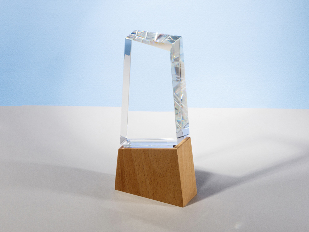 Награда выполнена из стекла, имеет необычную форму и расположена на деревянном постаменте. Лаконична и минималистична.