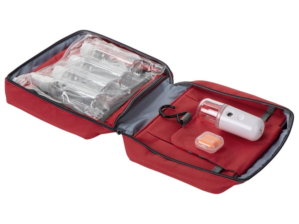 Материал товара: несессер- полиэстер, увлажнитель- пластик, емкости- ПВХ, беруши- полиуретан