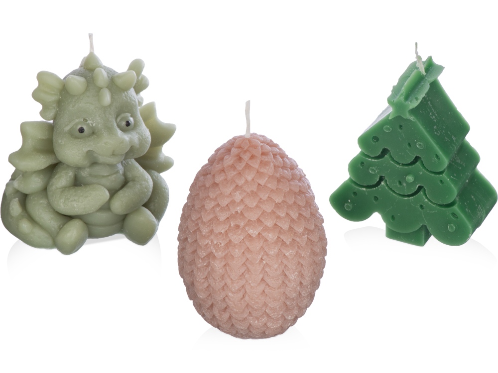 В набор входят три свечи на подставке — милый дракончик, яйцо и ёлка. Они подарят новогоднее настроение и ещё долго будут напоминать про год Дракона.