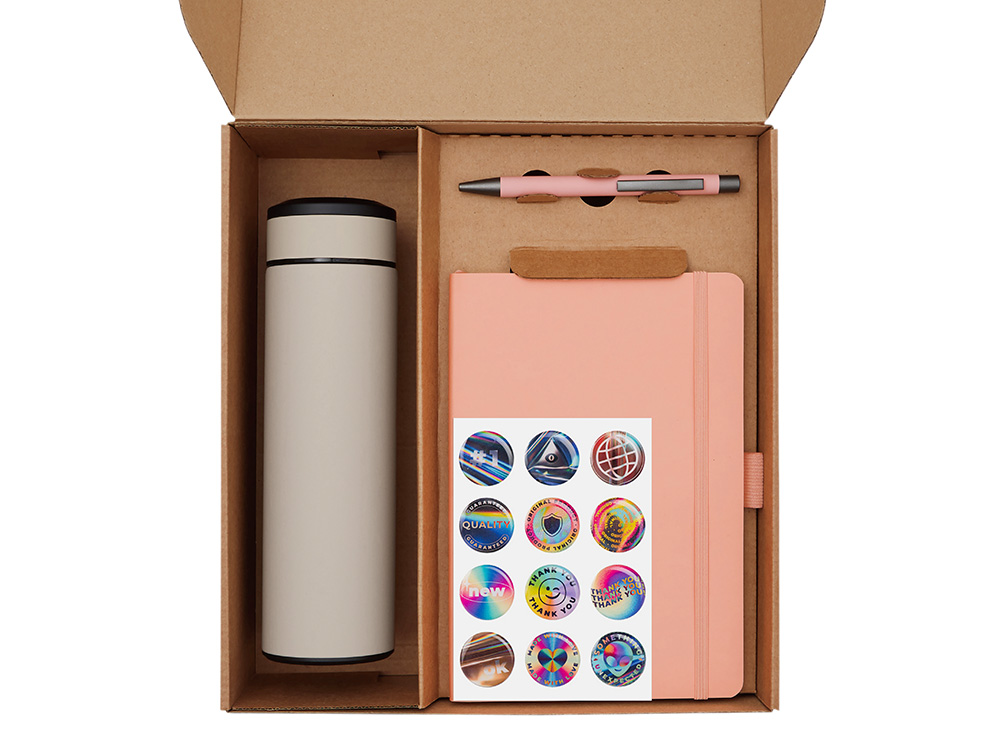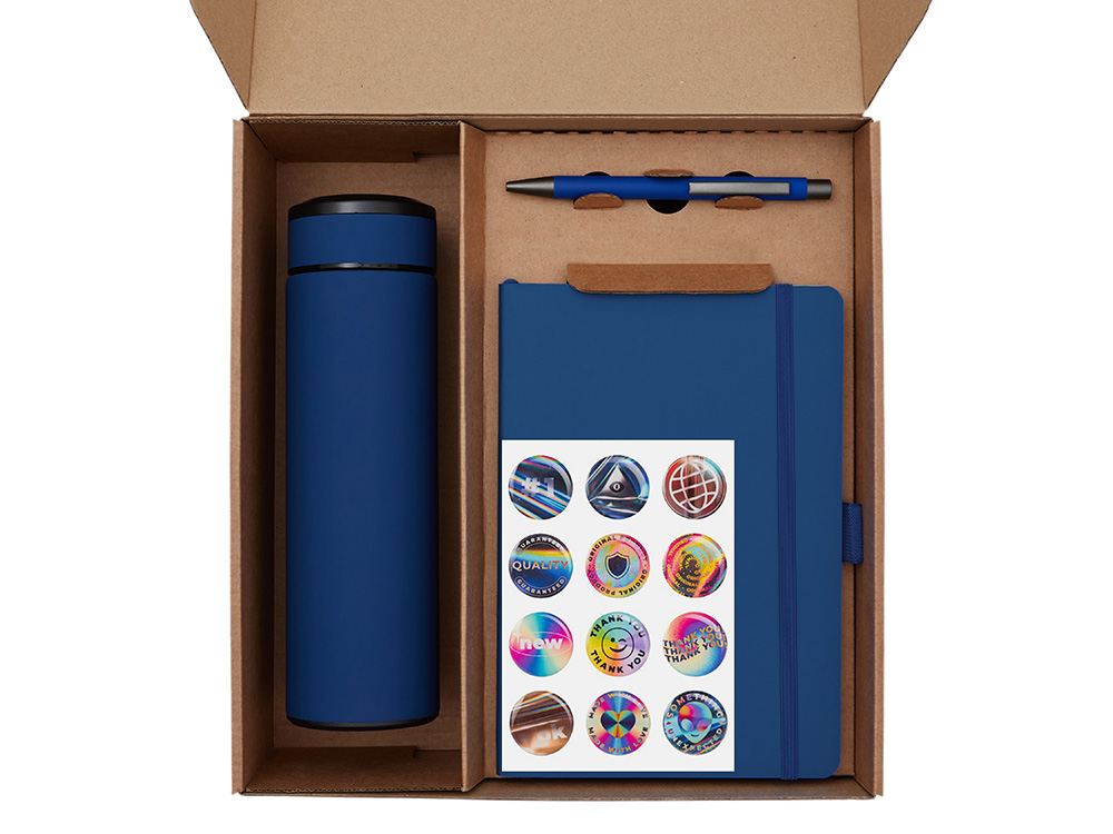 Материал товара: термос - нержавеющая cталь с покрытием soft-touch, блокнот - искусственая кожа soft-touch, ручка - металл с поверхностью soft-touch, чай - крафт-пакет, стикеры - смола, держатель для телефона - пластик, коробка - картон