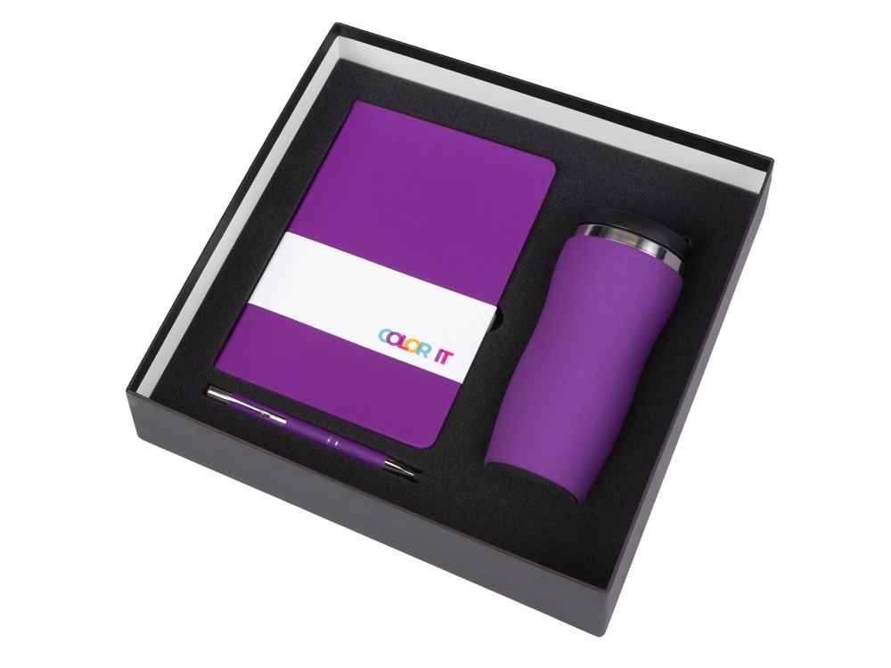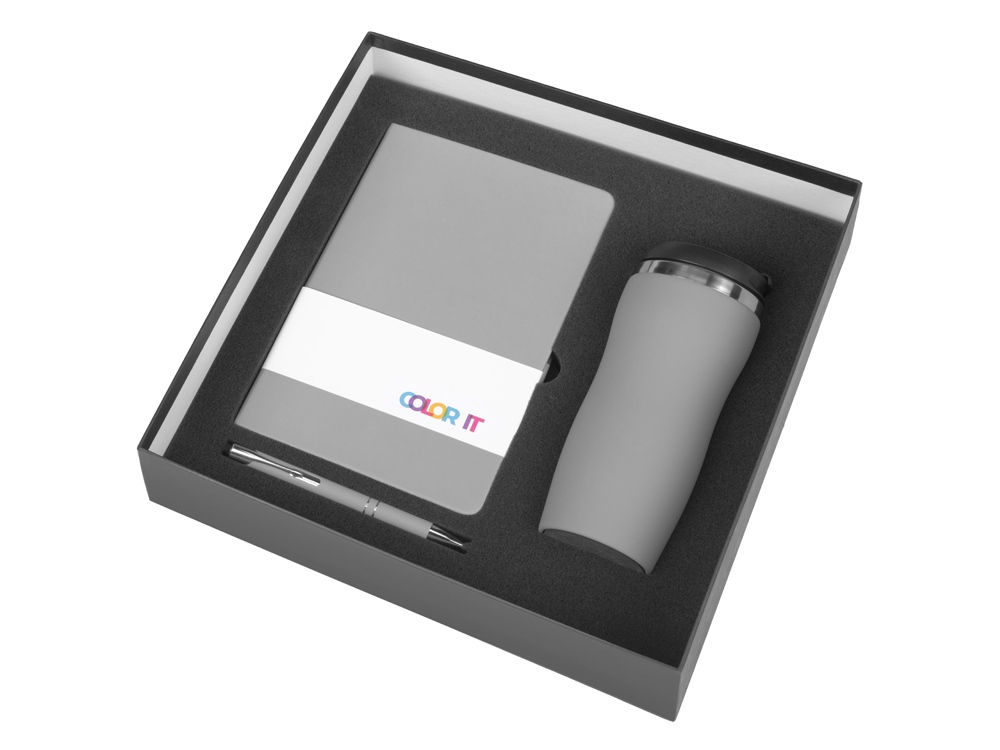 Материал товара: блокнот - искусственная кожа с покрытием soft-touch, ручка - алюминий с покрытием soft-touch, термокружка - нержавеющая cталь с покрытием soft-touch, коробка - картон
