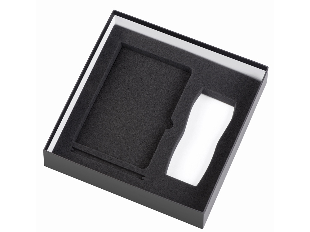 Бизнес-блокнот в твёрдой обложке имеет ляссе в тон обложки. Бумажный блок разлинован в линейку и выполнен из бумаги, полученной из древесины из специальных восполняемых лесных ресурсов, имеет сертификат FSC.