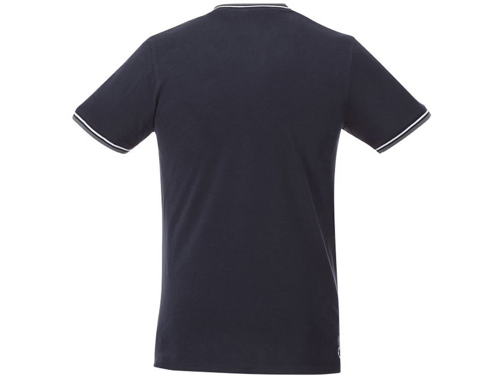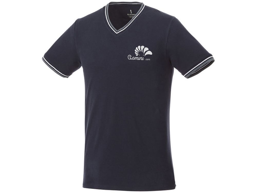Мужская футболка Elbert с коротким рукавом. Воротник гладкой вязкой в рубчик. Манжеты гладкой вязкой в рубчик. Контрастные окантовки.V-образная горловина. Двойная строчка на воротнике и внизу изделия. Комфортный ярлык-трансфер на изделии. Трикотажное пике, 100% хлопок. 180 г/м².