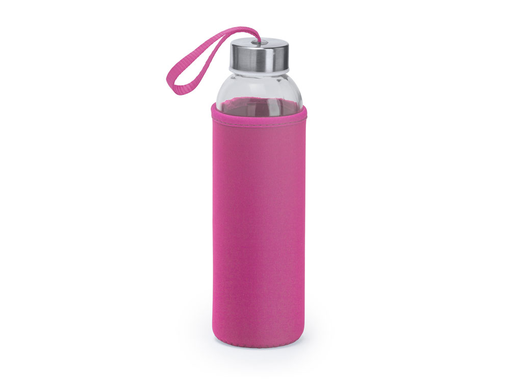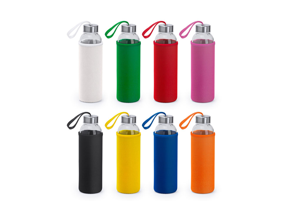 Стеклянная бутылка емкостью 500 мл, чехол из неопрена в сочетании с цветным ремешком для переноски.