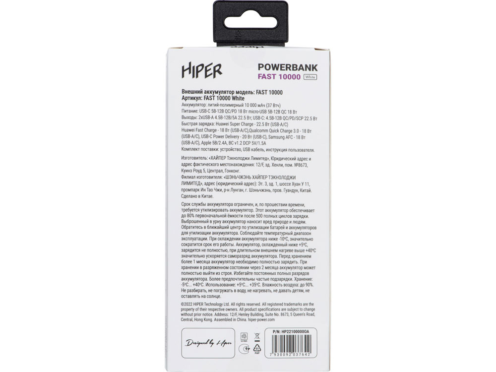 Портативный внешний аккумулятор HIPER FAST 10000 емкостью 10000 мАч (37Втч) оснащён двунаправленным портом USB-C, Micro-USB входом для зарядки, с поддержкой быстрой зарядки аккумулятора QC и PD, 2xUSB-A выходами, максимальный выходной ток 5А, максимальная мощность 22,5 Вт, поддержка быстрой зарядки стандарта QC 18 Вт, поддержка быстрой зарядки стандарта PD 18 Вт, стильный дизайн. Тампопечать (1 цвет (белые изделия)) на данный товар осуществляется бесплатно. Оплачивается только настройка оборудования в размере 3600 рублей на весь тираж.