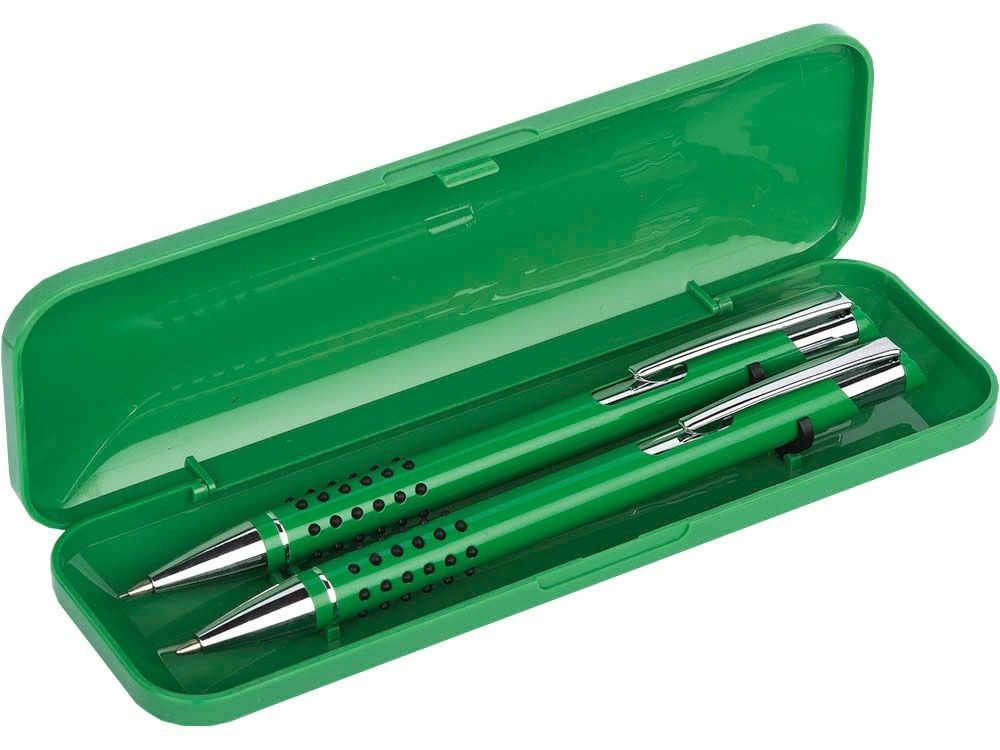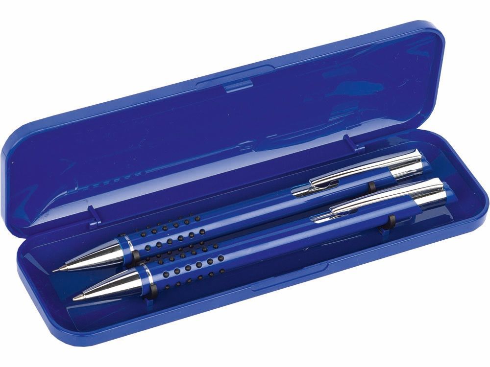 Набор письменных принадлежностей, состоящий из шариковой ручки с нажимным механизмом и механического карандаша, предлагается в компактном пластиковом футляре. На ручку, карандаш и футляр можно нанести логотип и подарить в качестве сувенира или небольшого презента клиенту компании.