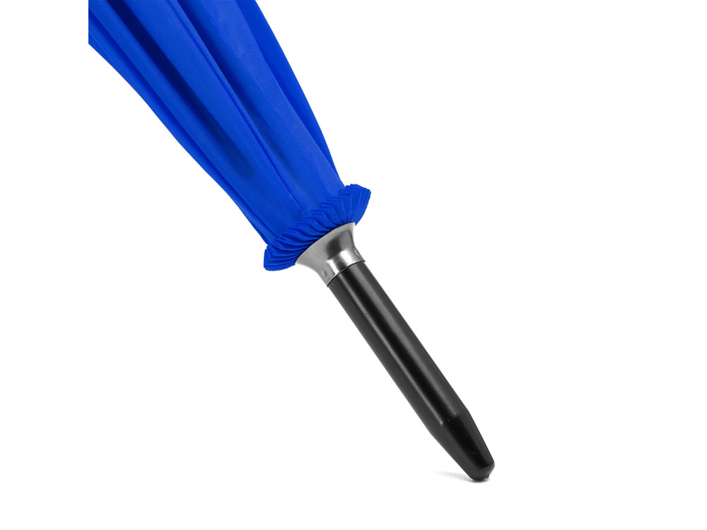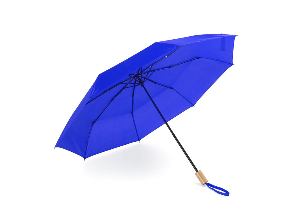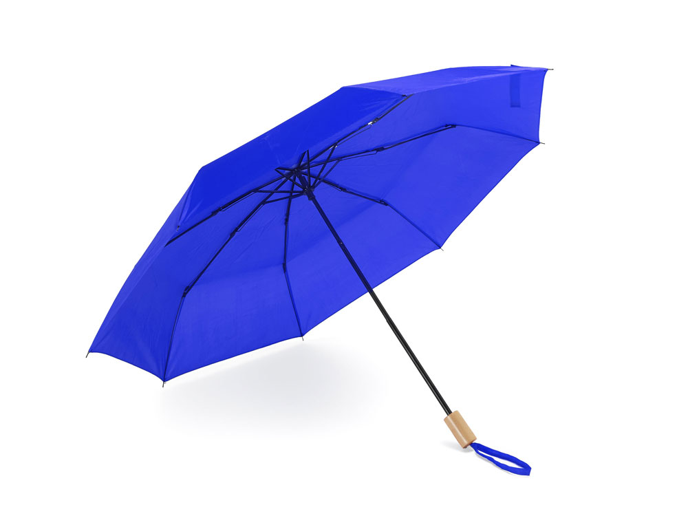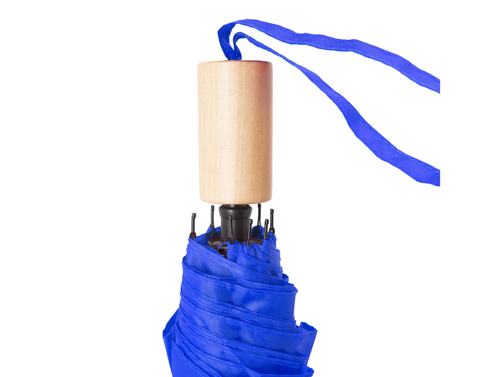 Механический складной зонт RPET с чехлом в тон. Стержень, спицы и наконечники черного цвета. Ручка из натурального дерева, соответствующая застежка-липучка. Диаметр 95 см.