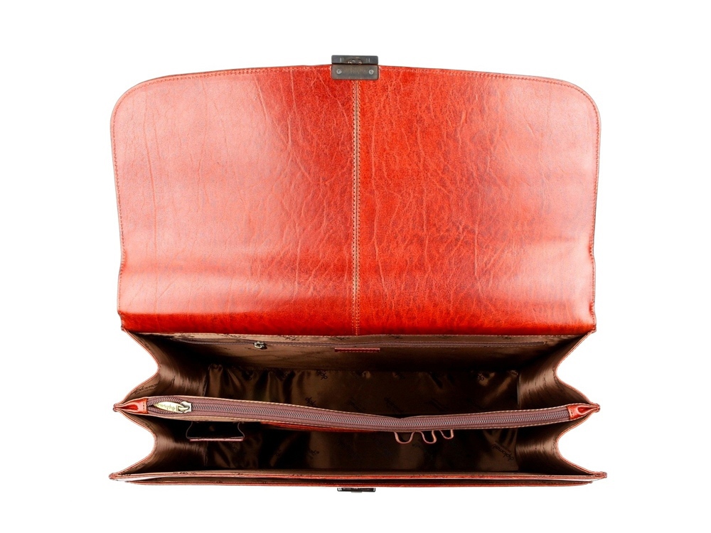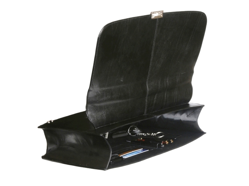 Элегантный женский портфель из качественной натуральной кожи черного цвета, овощной (vegetable) выделки. Портфель имеет основное отделение (для ноутбука до 13 дюймов и документов), одно отделение на молнии, кольцо для ключей, держатель для 3 ручек, 4 отделения для кредиток, отделение для телефона, что позволит аккуратно хранить и перевозить важные для ведения бизнеса документы. Удобная ручка для переноски, кодовый замок, металлические ножки. Без плечевого ремня.