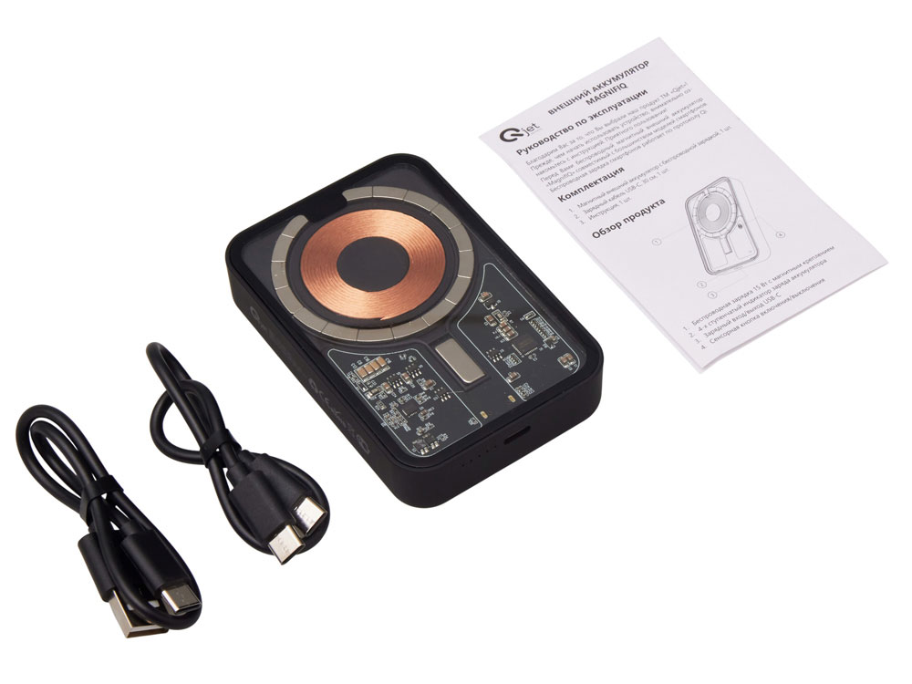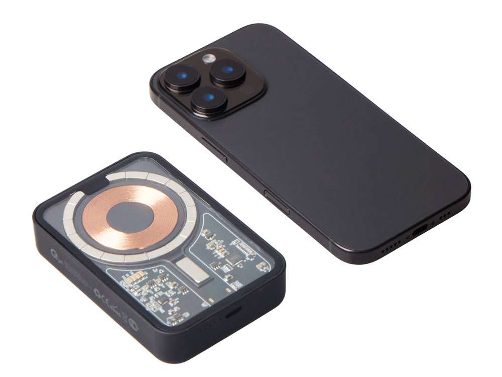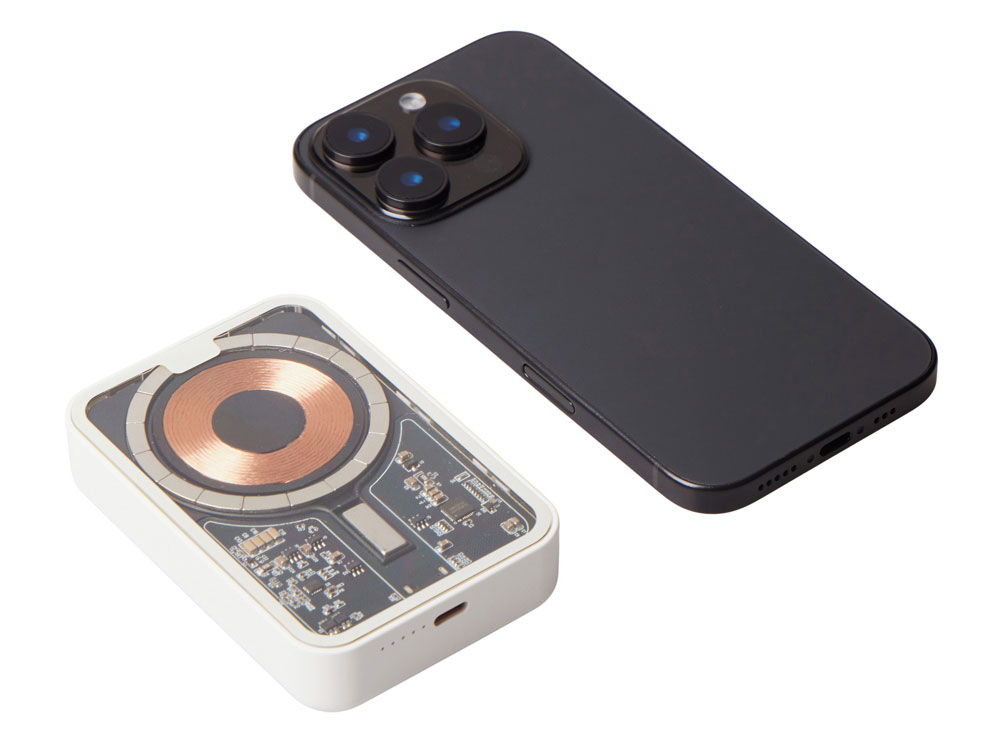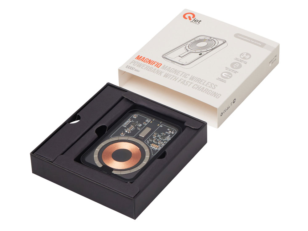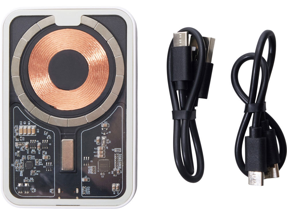 Беспроводной магнитный внешний аккумулятор MagnifIQ — технологичный и стильный power bank с эффектной прозрачной передней панелью, сквозь которую видны мощные магниты, индукционная катушка и электронная начинка. Ёмкость 10 000 мА·ч обеспечивает до 2–3 полных зарядов смартфона, а поддержка быстрой беспроводной зарядки до 15 Вт (с совместимостью QC/PD) делает процесс зарядки максимально быстрым и удобным. Двунаправленный USB-C порт позволяет как заряжать другие устройства, так и сам аккумулятор. Обе стороны корпуса подходят для нанесения логотипа: лицевая — через прозрачную панель, задняя — на приятное на ощупь soft-touch покрытие. Компактный, надёжный и сильный — идеальный технологичный продукт для продвижения и ежедневного использования. Поставляется в качественной упаковке с шубером, Двунаправленный кабель USB-C и кабель USB-A – USB-C в комплекте.