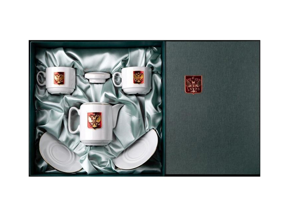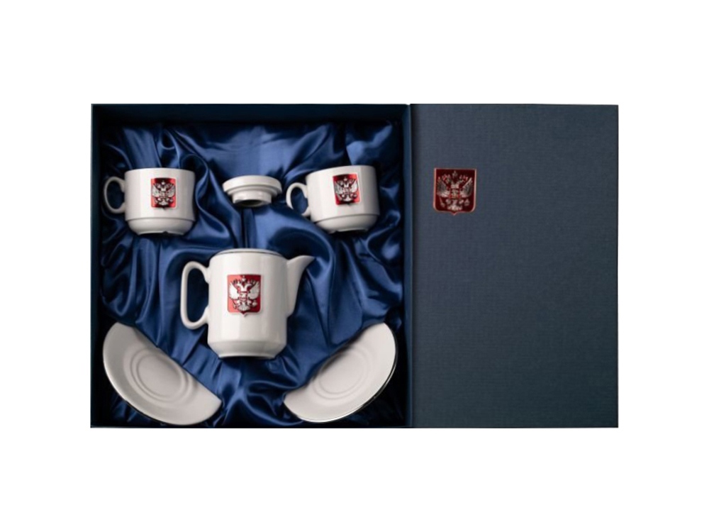 Подарочный набор фарфоровый с чайником Россия. Фарфоровый чайник и две фарфоровые чайные пары с золотой отводкой края чашки и блюца декорированная металлическим барельефом Двуглавый орел. Материал барельефа сплав алюминия с декоративным покрытием под золото и отделкой эмалью. Емкость чашек 220 мл., ёмкость чайника 500 мл. Ручная работа.