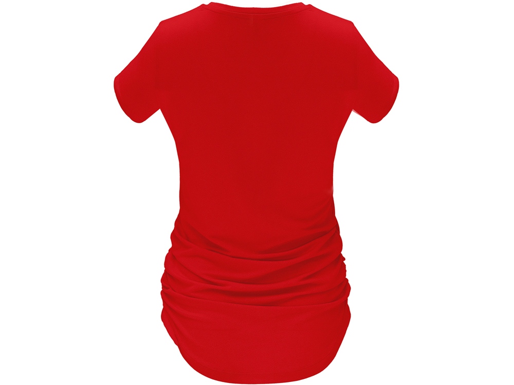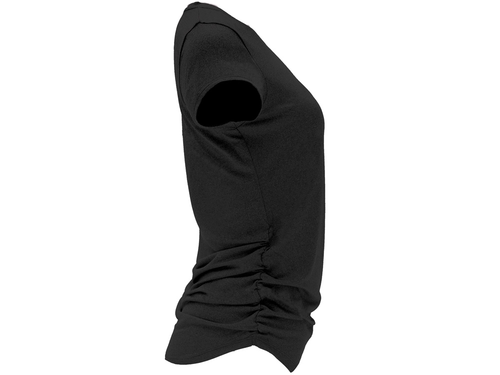Спортивная футболка с коротким рукавом для женщин. Полотно из полиэстера на ощупь напоминающее хлопок. Круглый вырез горловины обработан бейкой из того же полотна. Эластичная драпировка по боковым швам для лучшей посадки по фигуре. Узкий силуэт.