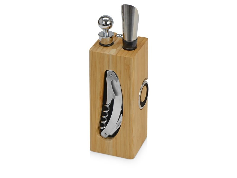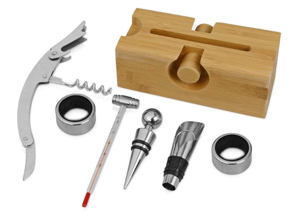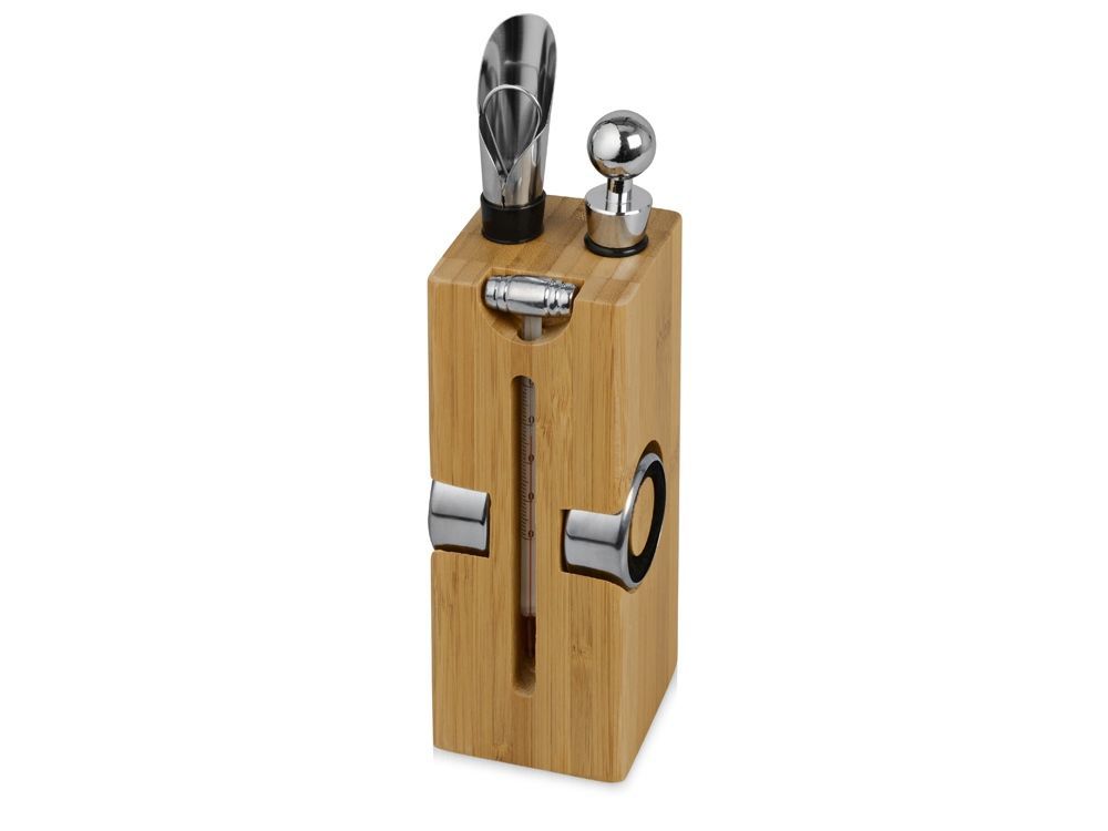 Стильный набор аксессуаров для вина на деревянной подставке поможет легко открыть бутылку и аккуратно разлить напиток при помощи штопора-открывалки, устройства для разлива вина и двух воротничков на бутылку. В набор также входят пробка для бутылки и термометр. Оригинальная деревянная подставка будет красиво смотреться на столе.
