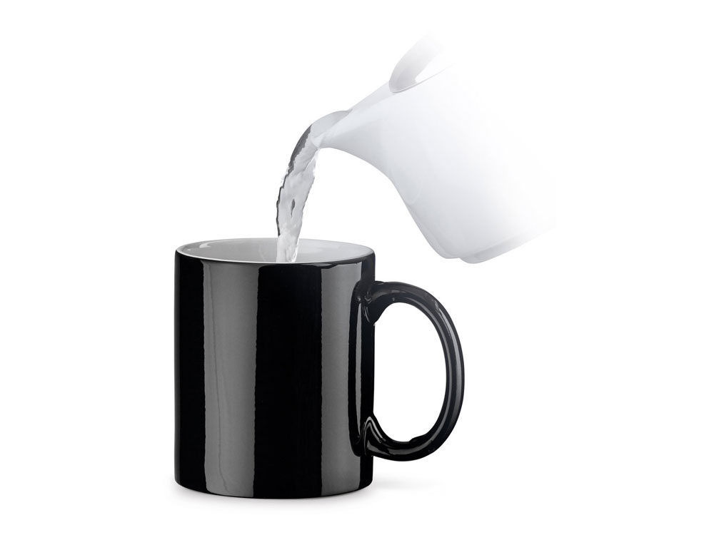 Керамическая кружка с термочувствительной глазурью, объем 350 мл. Подходит для сублимационной печати по всей площади. Печать появляется после наливания в кружку горячего напитка. Вид нанесения, рекомендуемый поставщиком: тампопечать, сублимационная печать