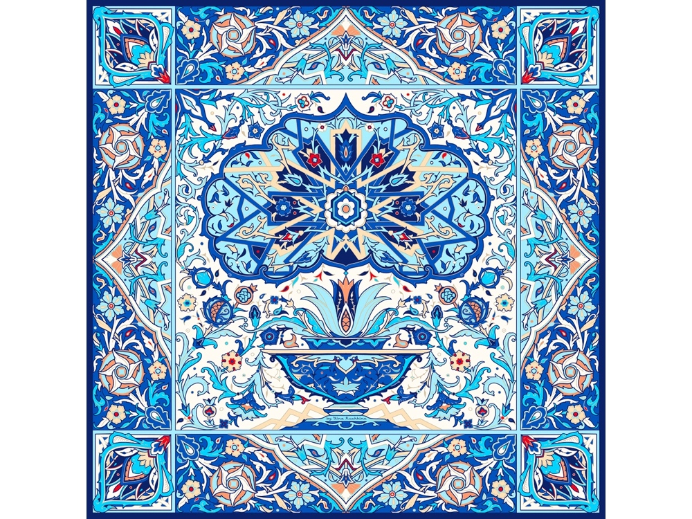 Легкое прикосновение шелка платка Арабески по ориентальным мотивам подарит частицу восточной магии. Растительно-геометрический орнамент и уточненная цветовая гамма навеют чарующие образы и сладкие грезы.