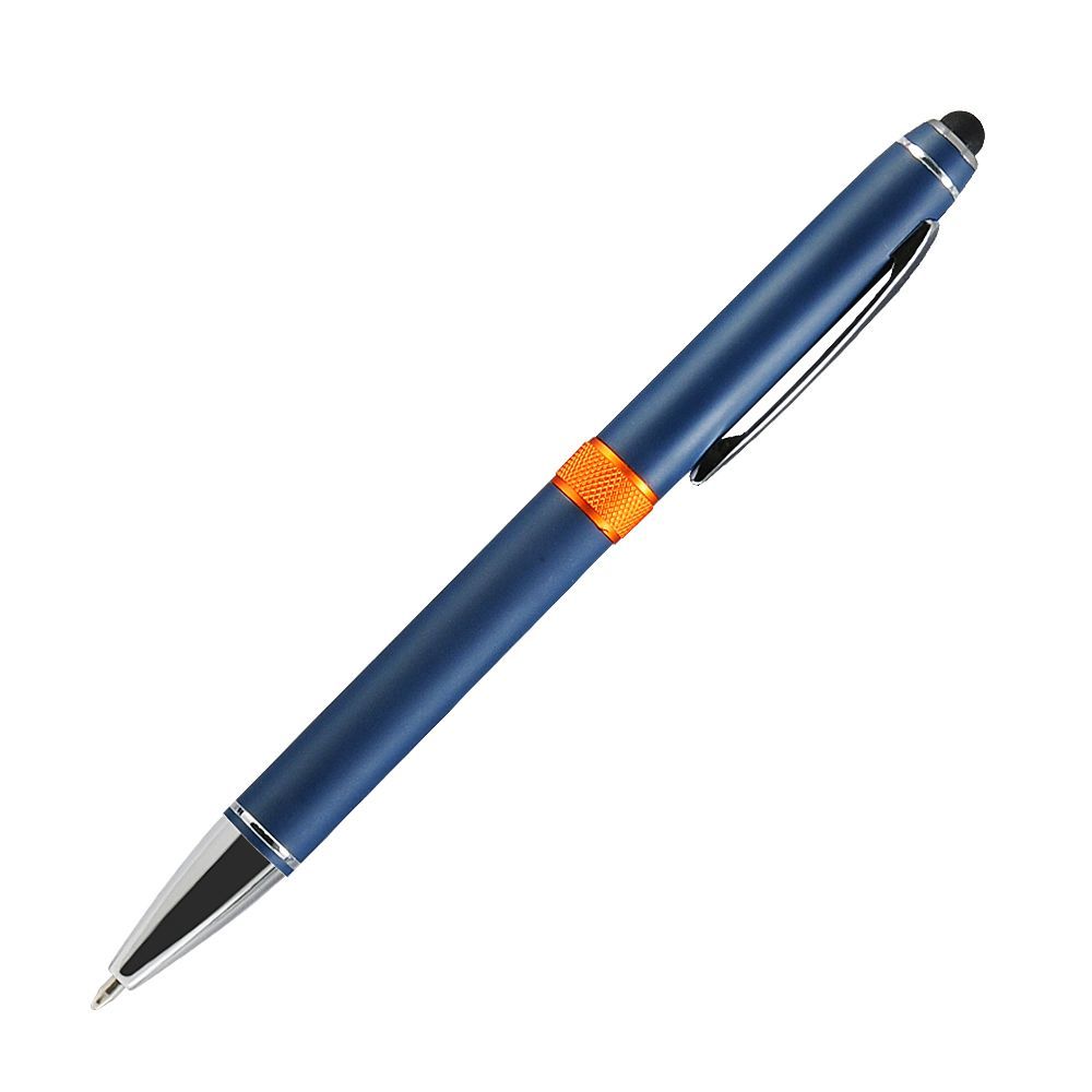 Шариковая ручка Ocean.Поворотный механизм,Стержень – «Cross type» Пишущий узел – 1 мм;Алюминиевый корпус, покрытие: синий матовый;Срединное кольцо – гравировка: оранжевый;Силиконовый стилус на торце (черный цвет).